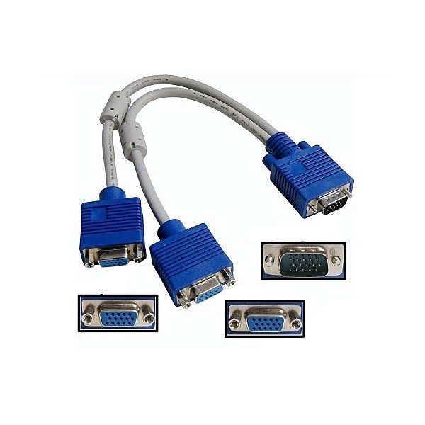 - Two female VGA sockets on the cable connect to the VGA cables of two separate displays