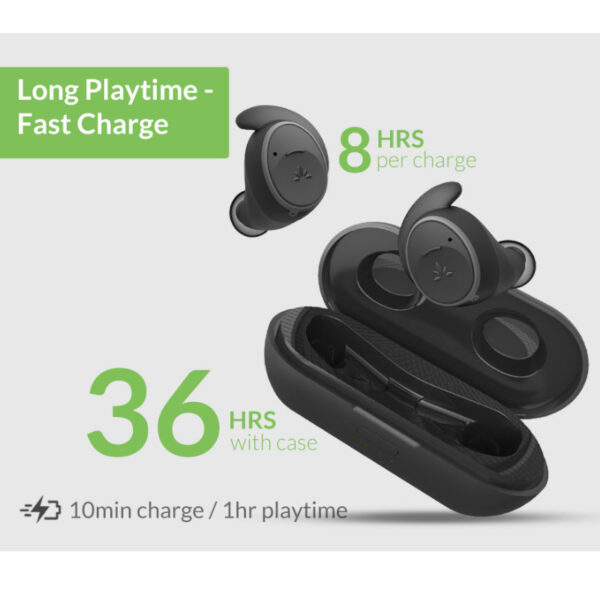 One full charge provides up to 8 hours of playtime while the charging case extends playtime with an additional