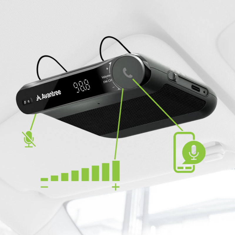 Features one-button access to Siri or Google Assistant, FM transmitter, Automatic power on/off with noise reduction